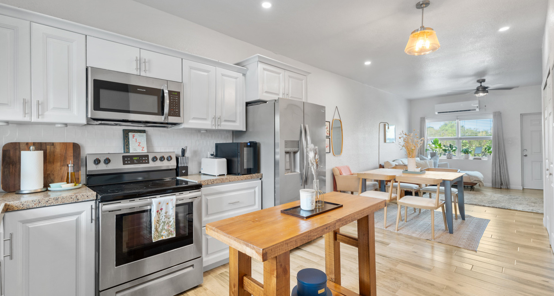 This well-maintained single-family residence offers 2 bedrooms and 2 bathrooms, making it suitable for first-time home buyers or investors. The contemporary kitchen is outfitted with stainless steel appliances, an island, dishwasher, and microwave, ensuring efficient meal preparation and entertaining. The property features a backyard patio, that overlooks a generous yard with several fruit trees at